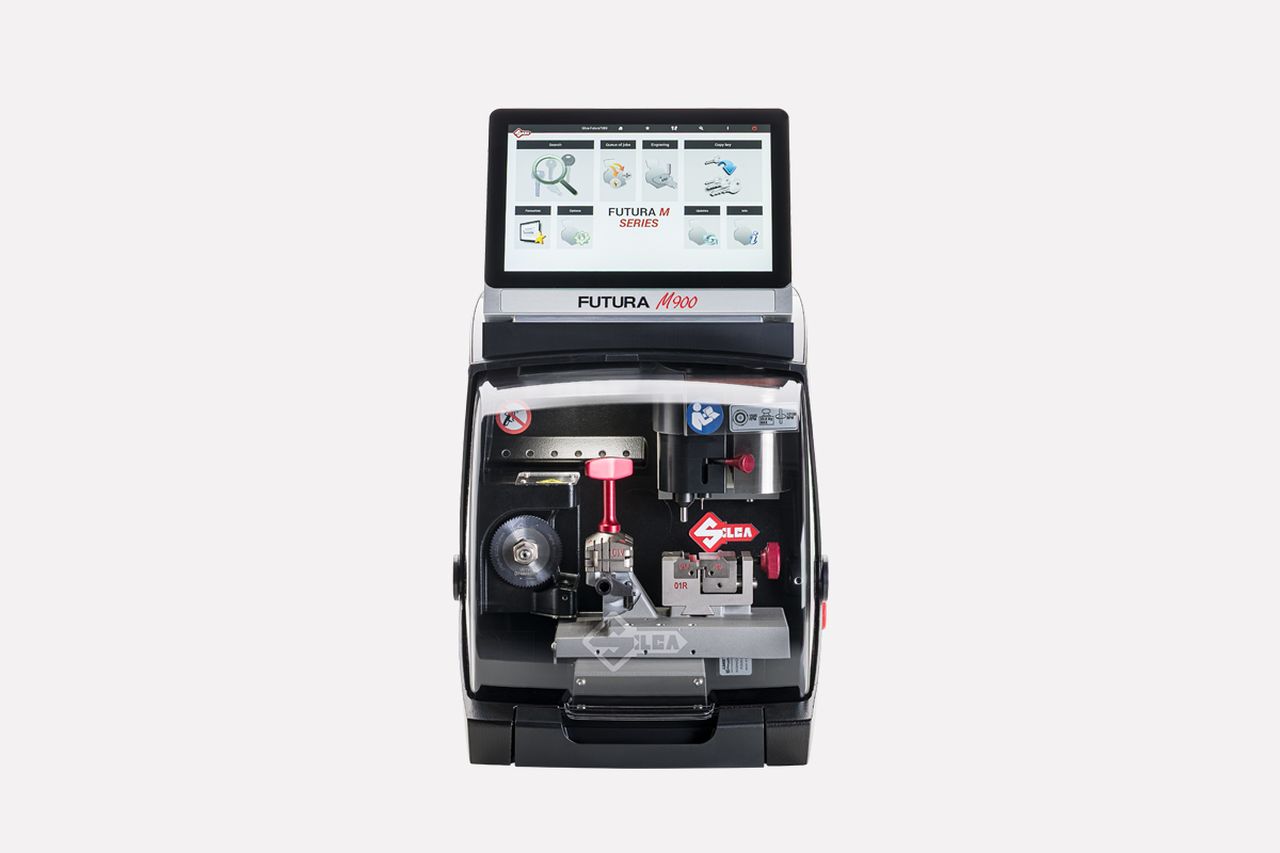 Futura M900 está equipada con una estación de corte doble, lo que permite duplicar llaves planas, cruzadas, láser y punzonadas, tanto para uso residencial como automovilístico, utilizando una sola máquina. Grabado optimizado para una amplia gama de llaves, medallas y placas.